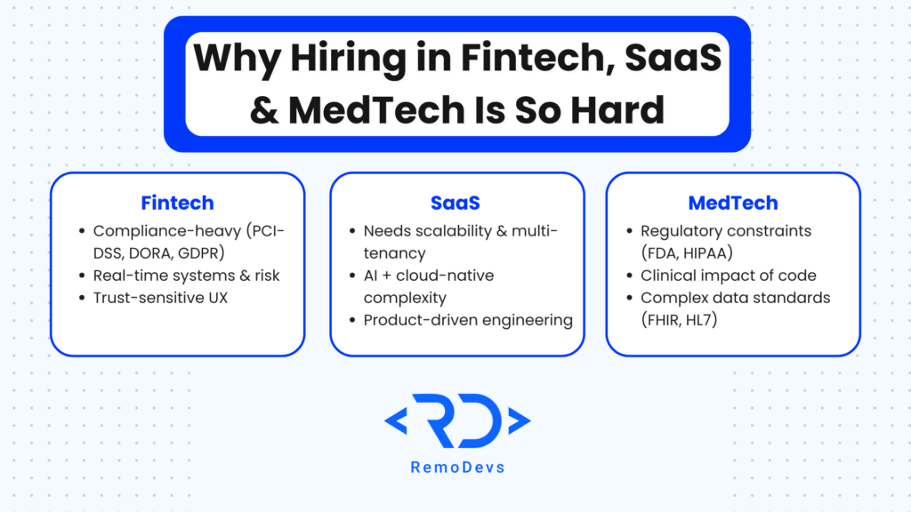 - Fintech, SaaS, and MedTech are the three verticals where RemoDevs has the deepest hiring expertise and the strongest candidate networks.