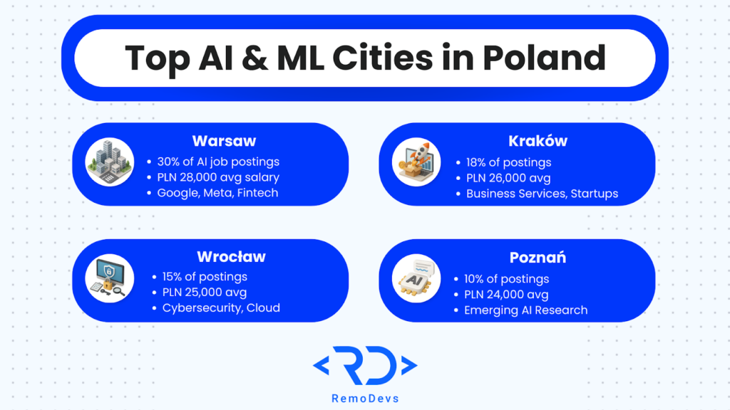 Poland’s tech talent is distributed across several key metropolitan areas, each with its own specialization.