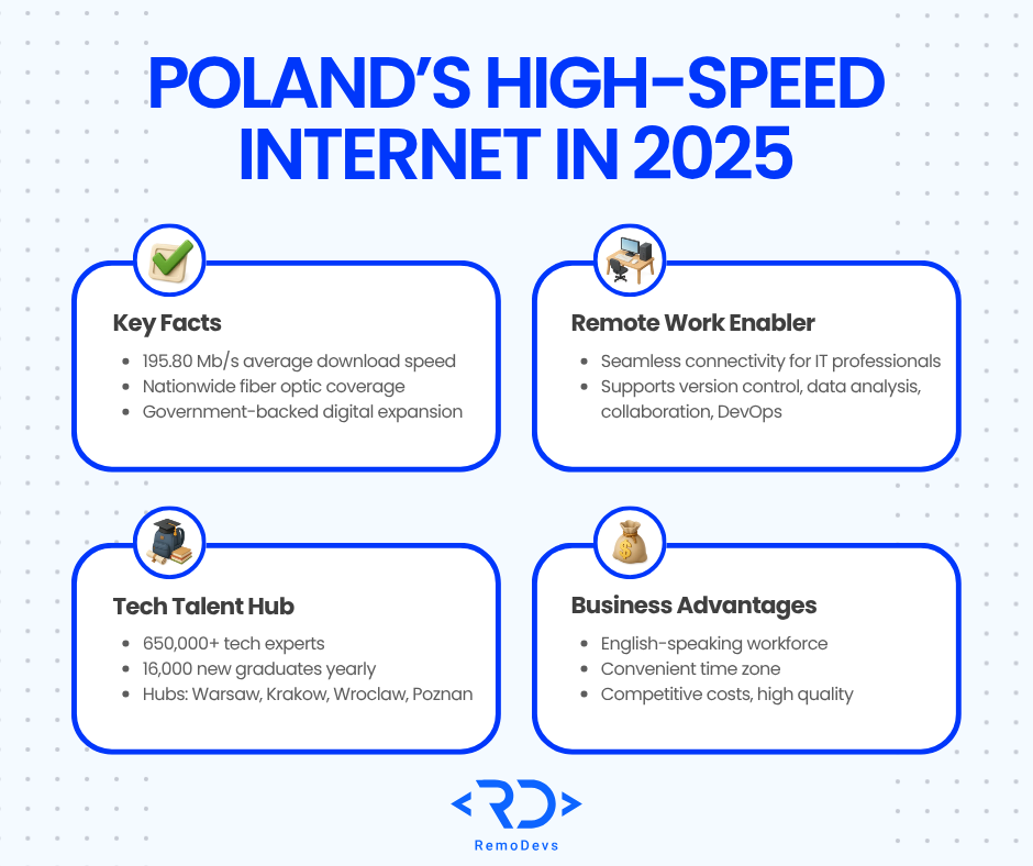 Discover how Poland’s robust infrastructure and skilled workforce can elevate your technology capabilities. Contact RemoDevs today to get started.