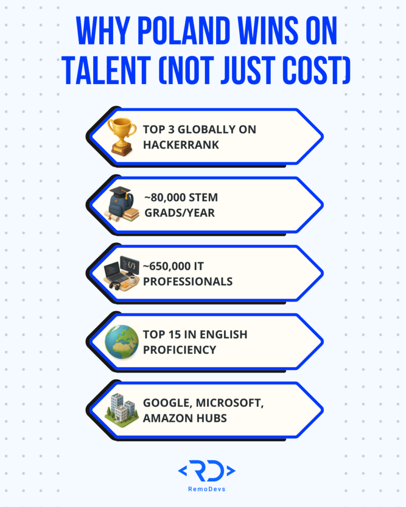 • Poland produces ~80,000 STEM graduates per year and consistently ranks in the top 3 globally for developer skill on HackerRank – this is not a compromise, it’s an upgrade.