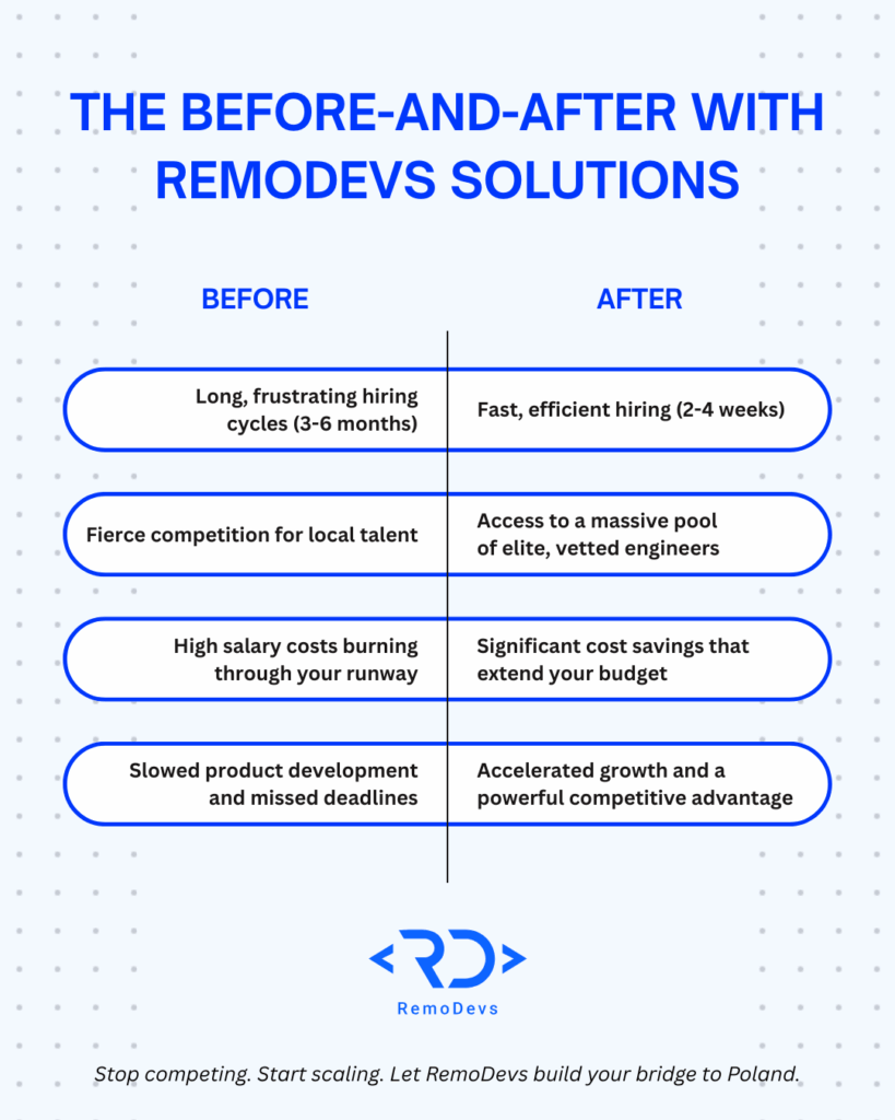 Don’t let talent gaps hold you back. Contact RemoDevs today for a free consultation and discover how hiring top Polish developers can help your startup soar!